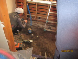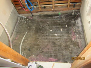 土間コンクリートを打ちレベル調整します。水道の配管工事もユニットバス取り付けまでに済ませておきます。
